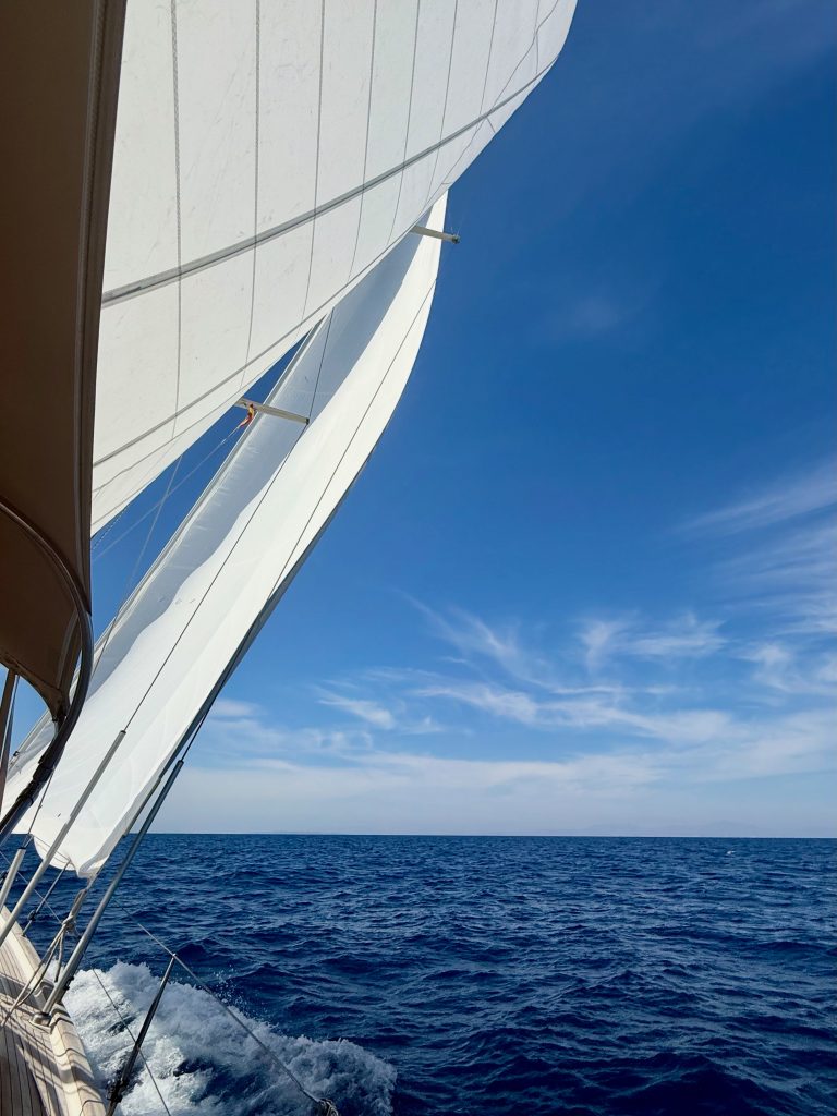 Wir sind direkt los und haben um 10:45 die Segel gesetzt. Nur das Vorsegel, da wir 15-20 Knoten Wind hatten. Der Wind hatte auch genug Zeit um eine ordentliche Welle aufzubauen. Also war es sehr schaukelig. Ich war das natürlich nicht gewöhnt, da wir schon seit einiger Zeit an Land sind also wurde mir praktisch direkt schlecht. Wir haben direkt das Wachsystem implementiert und ich musste theoretisch erst um 15 Uhr Wache halten und habe mich so entschieden unter Deck zu gehen um ein wenig die Augen zuzumachen. Dies hat sich als eine schlechte Idee erwiesen. Wir konnten natürlich nicht die Luken aufmachen und die Luft unter Deck hat sich sofort gestaut und dies hat meinen Zustand nur verschlimmert.