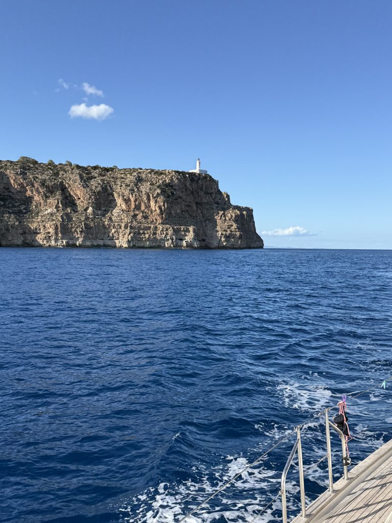 Zwischendurch haben wir uns dazu entschieden auf der südlichen spitze von Formentera zu ankern. Der Plan war kurz zu ankern und ins Wasser zu springen und dann nach ein paar sSunden wieder loszufahren. Nach Ansteuerung der Insel haben wir allerdings entdeckt, dass ziemlich viel Müll im Wasser ist. Wir sind darauf ein wenig die Küste der Insel entlang bis wir eine Bucht entdeckt haben, wo es etwas besser aussah. Meine Mutter hat die Ansteuerung und das Anker Manöver gemacht und ich bin zumindest der Meinung, das sie das gut gemeistert hat.