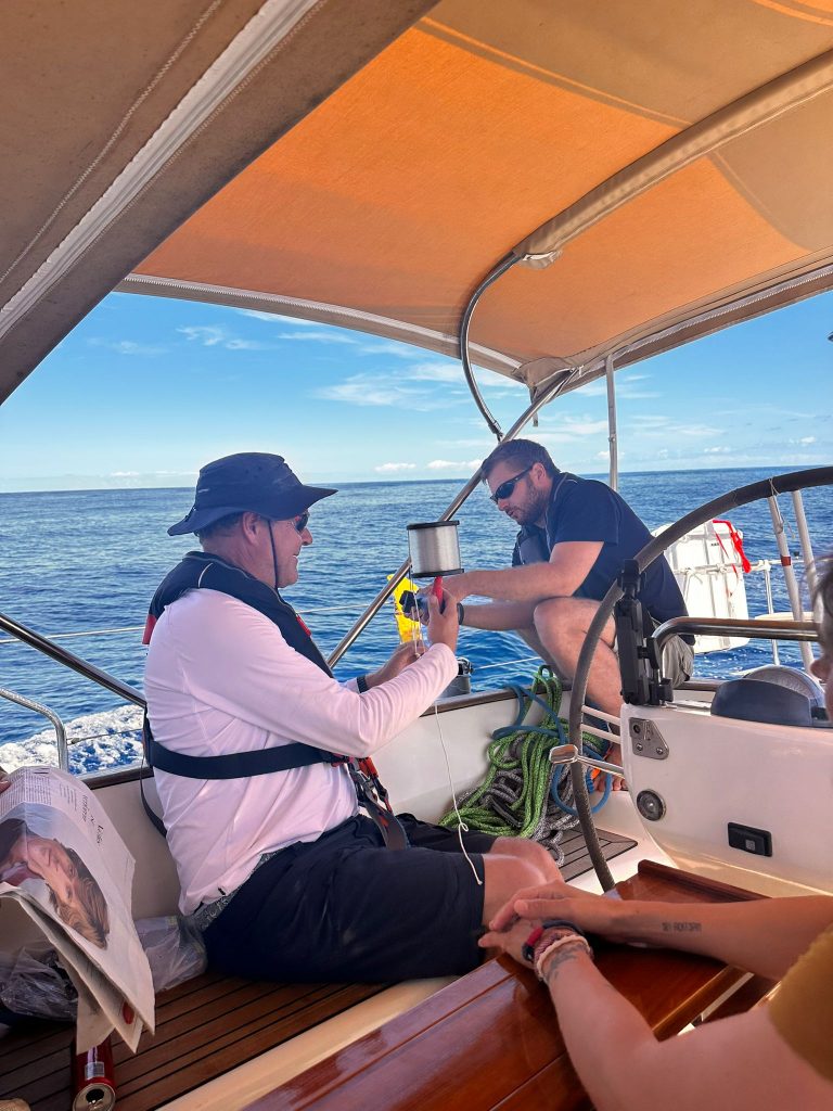 Erschlagen also habe ich mich auf das Deck begeben wo es nicht wirklich besser geworden ist. Nach einiger Medizin wieder ging es mir aber wieder gut. Der Tag war ziemlich ereignislos. Eine Sache die auf jeden Fall dokumentiert gehört ist der fisch Versuch meines Vaters. Dieser hat sich in Carloforte ein wenig Equipment besorgt und wollte es unbedingt ausprobieren. Mein Vater und der andere Alex haben sich also daran gemacht aus den Utensilien irgendeine Angel Konstruktion zu basteln. Eine Cola Dose diente als Geräuschmacher im Falle das etwas anbeisst. Das hat leider nichts gebracht (ausser einer Plastik tüte) aber spass hat es trotzdem gemacht.