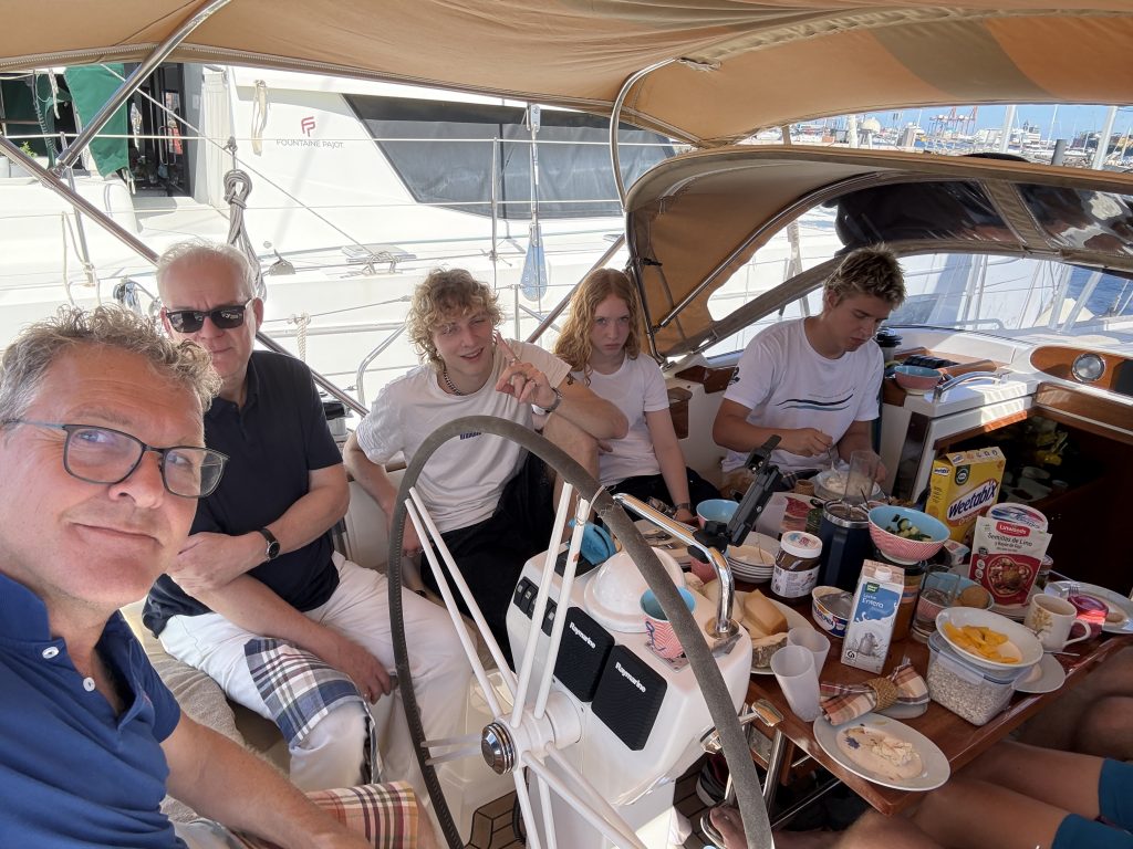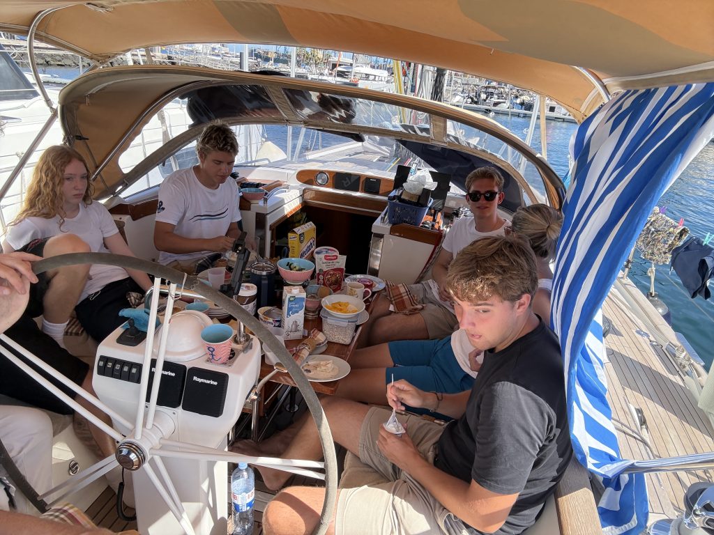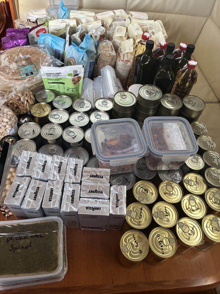 Gebunkert wurde in drei Etappen. Erst das ganz Langzeit haltbare Essen in Dosen, und Gläsern, auch die großen Mengen von Nudeln, Reis, Bulgur, Linsen, Kichererbsen, Mehl. Sowie Getränke. Dann der zweite Einkauf, mit den ganzen Milchprodukten sowie Fleisch, Wurst, Schinken. Und zuletzt dann Obst und Gemüse. Das alles zu verstauen ist gar nicht so einfach, vor allem nach unseren Erfahrungen was beim starken Rollen des Schiffes alles durch die Gegend fliegen kann. Was aber uns zu Gute kommt, ist dass wir eine Kabine nicht für Crew benötigen. Emil und Valentin haben die Seitenkabine ausgesucht, weil man tatsächlich in den Stockbetten mit Leesegel ganz gut schlafen kann. Somit ist die Bugkabine Lager geworden. Da verstauen wir auch die Segel, die momentan nicht so oft gebraucht werden und die zwei kleinen Klappräder, die wir hier von der Crew einer 56er Oyster abkaufen konnten.