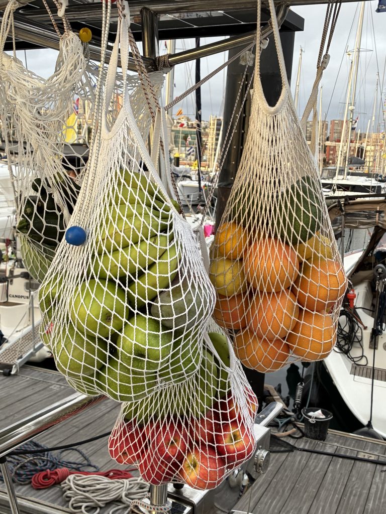 Sehr bewährt hat sich das Aufhängen von Obst und Gemüse in Netzen unter den Solar Paneelen am Heck. Da sind zB Äpfel, Zitrusfrüchte, Gurken, Zwiebel und Paprika und Kartoffel aufgehängt. Die schwingen ein bisschen hin und her, daher ist es auch sinnvoll sie hinter einem aufzuhängen, denn wenn man das Schwingen länger beobachtet trägt es mit zur Seekrankheit bei.