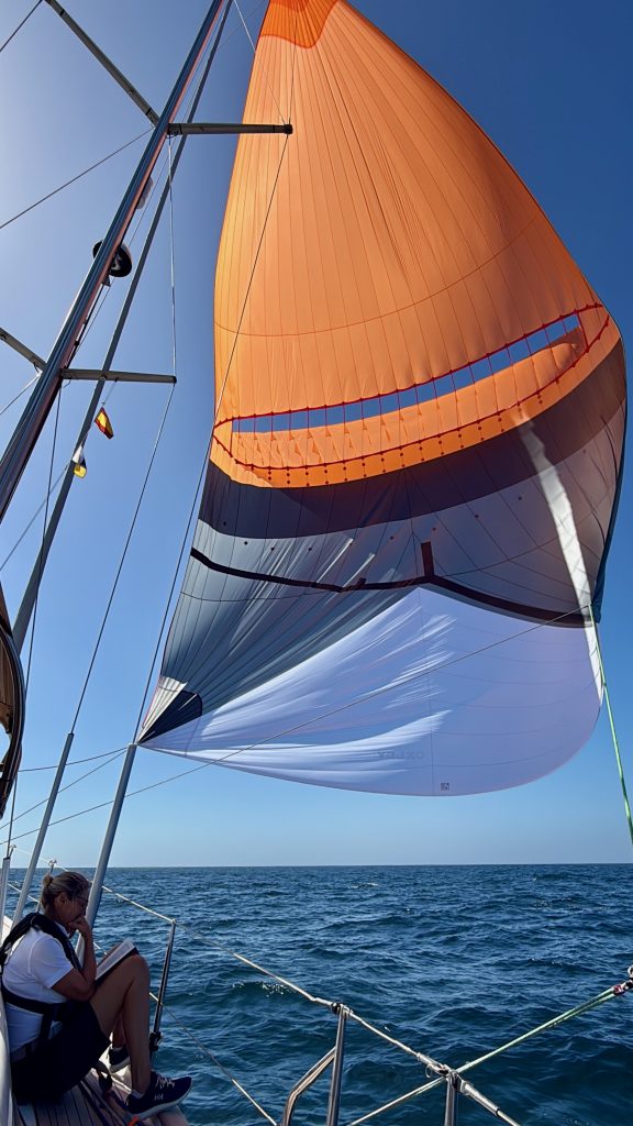 Der Wind stirbt und am Nachmittag müssen wir nach über 24 Stunden das Parasail bergen. Wir sind trotz wenig Wind gut gelaunt; das reparierte Parasail funktioniert einwandfrei. Sobald wir den Motor anwerfen, kommen Delfine. Meine Theorie ist, dass sie vom Motor eher interessiert sind als abgestoßen, wie es eigentlich von den meisten behauptet wird. Auf unserer Gibraltar-Rubicon-Reise ist das genau gleiche passiert.