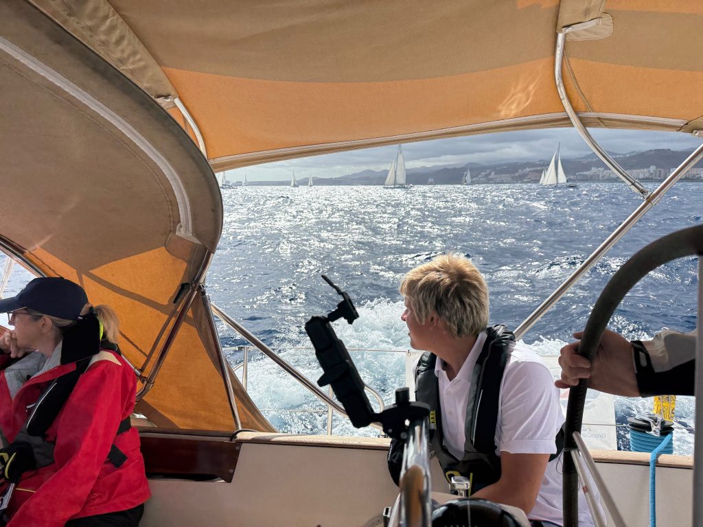 Naja, wir segeln also, sobald es Valentin wieder gut geht, durch den Start. Kurs ist die Küste Afrikas. Die Segel werden eingestellt. Preventer für das Groß, Spibaum für die Genua. Wir werden Butterfly fahren.