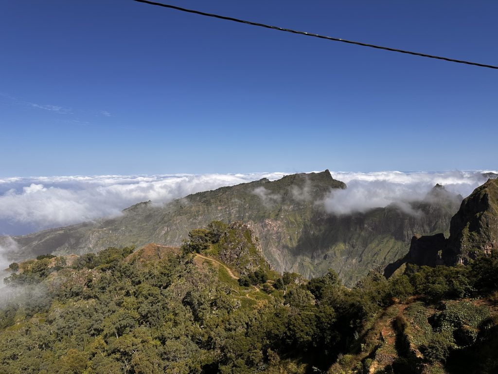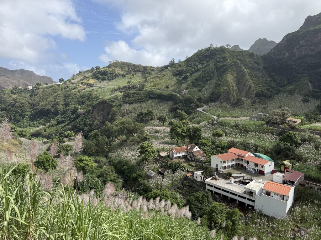 Um 5:30 war Tagwache, um 6 ging es los Richtung Fähre und dann eine Stunde nach Sao Antao, die grüne Insel. Auch hier waren wir natürlich wieder eine große Runde, haben allerdings die Busse aufgeteilt und die Stationen sind unterschiedlich angefahren worden. Das Spannende hier ist, dass die Portugiesen viele Bäume aus Europa brachten und diese auf den Bergspitzen angepflanzt haben. Mittlerweile ist dort ein richtiger Wald. Dadurch werden auch die Wolken auf den Bergen gehalten, regnen teilweise ab. Es gibt ein großes Tal mit fließendem Wasser, das sehr grün und sehr fruchtbar ist. Alles wird durcheinander angepflanzt. Mais, Maniok, Bananen, Affenbrotbäume, Yams, Avocado, Mangos…