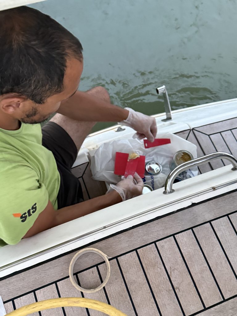Nach unserem Skipper Briefing mussten wir feststellen dass ein Halter unserer Badeleiter abgebrochen war (bzw die Schrauben gebrochen waren). Leider war ich so unvorsichtig und habe den Halter ins Wasser fallen lassen. Und das Wasser hier in der Marina ist eher nicht geeignet zum Tauchen. Unser netter Nachbar (und eigentlich unser Haupt Konkurrent) hat uns geholfen mit Epoxi Spachtel um die Löcher zu schließen. Bei der ganzen Aktion mussten wir noch feststellen dass die Hydraulik des Dinghis einen Schaden hat. Also noch einen Flaschenzug basteln. Ich hoffe das ist kein böses Omen für den Start morgen früh.