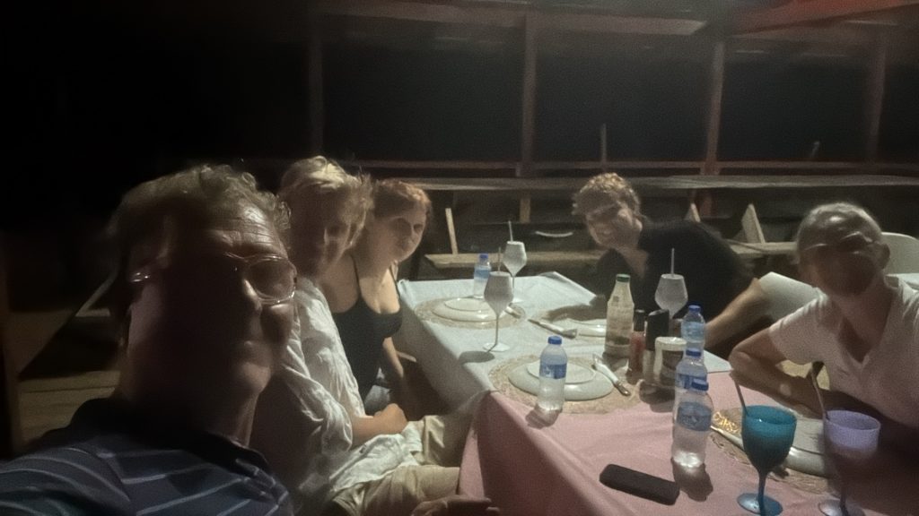 In der Zwischenzeit ist es dunkel geworden und wir hatten in einer kleinen Bucht in einem Lokal reserviert. Wir kommen also in die Bucht, alles dunkel, man sieht eine Hütte und nördlich davon eine Taschenlampe blinken. Dort sollen wir mit dem Dinghi hinfahren. Also geankert, Dinghi heruntergelassen mit dem Seilzug (das wisst Ihr ja noch nicht aber die Hydraulik vom Dinghi ist auch kaputt). Motor montiert, Dieseltank ins Dinghi und: Das Dinghi ist undicht und halbvoll mit Wasser.