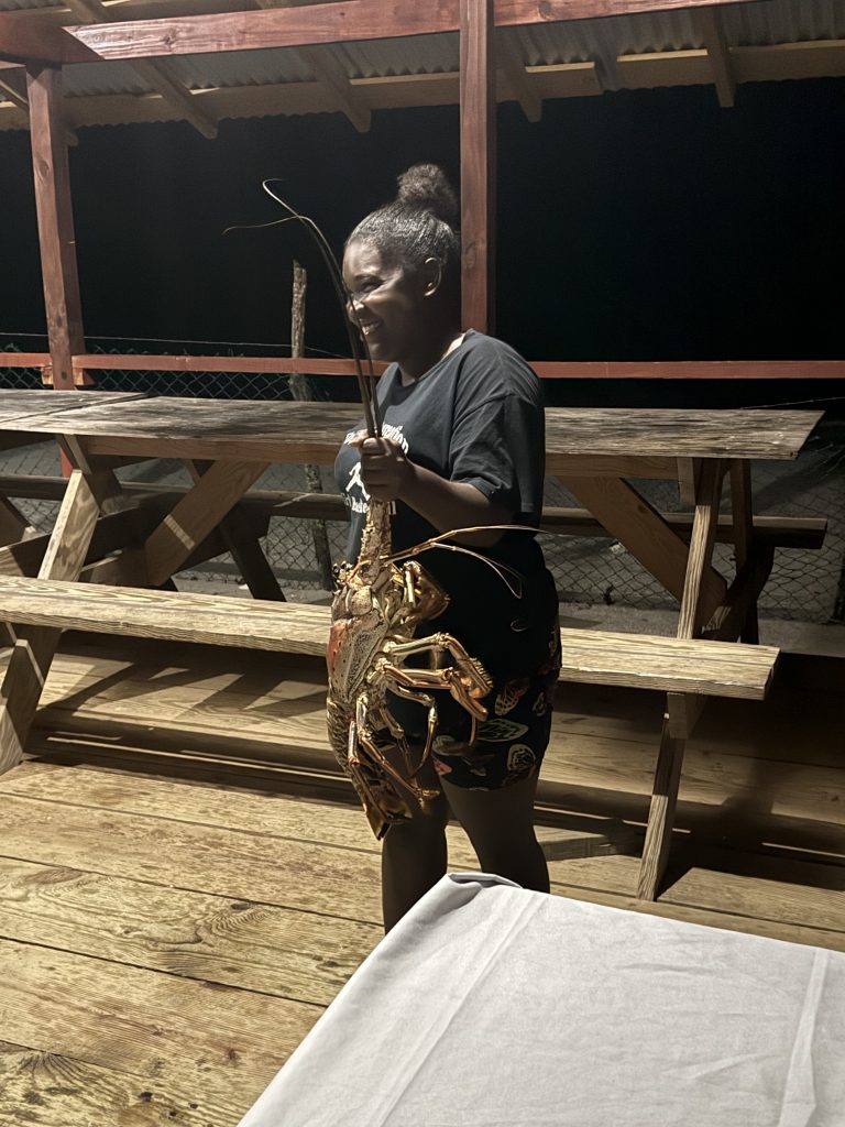 Es war recht abenteuerlich in der Dunkelheit mit halb abgesoffenem Dinghi auf einen Strand zu fahren, den man nicht sieht. Elina hat geglaubt ihr letztes Stündchen hat geschlagen und ich habe auch gefunden, dass die Atlantiküberquerung nicht halb so wild war! Aber wir wurden belohnt. Die Bucht ist nur mit dem Schiff zu erreichen, es steht genau eine Hütte da und wir waren die einzigen Gäste. Es gab herrlichen Hummer, Hühnchen und Fisch. Dazu Pinacolada und Rumpunch. Und das alleine in einer schönen Bucht!